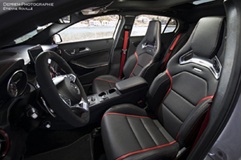 Je laisse généreusement le volant à mon rédacteur en chef pour la première partie, autoroutière. J’en profite pour détailler l’intérieur, ses inserts carbone, ses sièges baquets fort accueillants, ses touches de rouge (aérateurs, ceintures, surpiqûres, etc.). C’est flatteur et agréable à l’œil. Agréable aussi, le confort. Bien qu’en passager, je remarque immédiatement la différence avec la Classe A 45 AMG très ferme. Il en va de même pour la bande sonore, très discrète dans ces conditions, permettant de faire de longs trajets sans fatigue auditive.