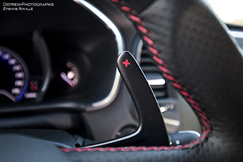 … N’a rien à envier à l’extérieur en termes de traitement et de soin. Le plus visible concerne les sièges baquets particulièrement enveloppants, recouverts sur mon modèle d’essai de la sellerie alcantara. Bien qu’ils soient directement issus de la Mégane GT, ils ont reçu un traitement spécifique pour plus de moelleux. Ils reçoivent, pour un aspect encore plus sportif, des surpiqûres rouges que l’on retrouve également sur le levier de vitesse, les contre-portes ainsi que sur le volant siglé R.S. Ce dernier, tout comme sur l’Alpine A110, semble avoir été monté à l’envers avec le revêtement non glissant, l’alcantara, sur les parties haute et basse tandis que les mains saisissent un revêtement en cuir, le choix étonne toujours autant. ![]()