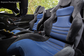 Plutôt que de me gargariser de chiffres encore et encore, je me dépêche de prendre le volant. Je m’installe dans les superbes sièges baquets noir et bleu, je tourne la clef rouge (ça commence à faire beaucoup de couleurs !) et j’appuie sur le bouton « Start », rouge lui aussi. Dès le réveil, les 8 cylindres en V me font comprendre qu’ils ne sont pas là pour plaisanter, le son est rauque, puissant et, même à l’arrêt, j’ai l’impression que la cavalerie me pousse. Je la fais encore attendre un peu, 14 secondes exactement, soit le temps de rentrer le toit escamotable pour profiter pleinement de cette édition limitée à seulement 499 exemplaires.